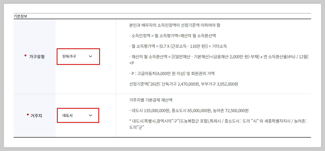 - 단독가구 / 부부가구 선택: 이 단계에서 계산 기준이 달라집니다.