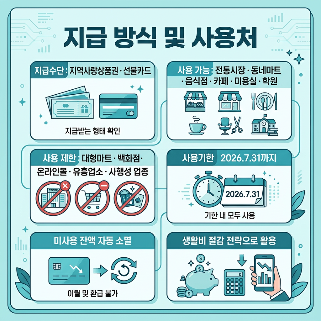 또한 단순한 현금 지급이 아닌 지역사랑상품권 또는 선불카드 형태로 지급함으로써 자금이 외부로 유출되지 않고, 지역 내 소비로 이어지도록 설계되어 있습니다.