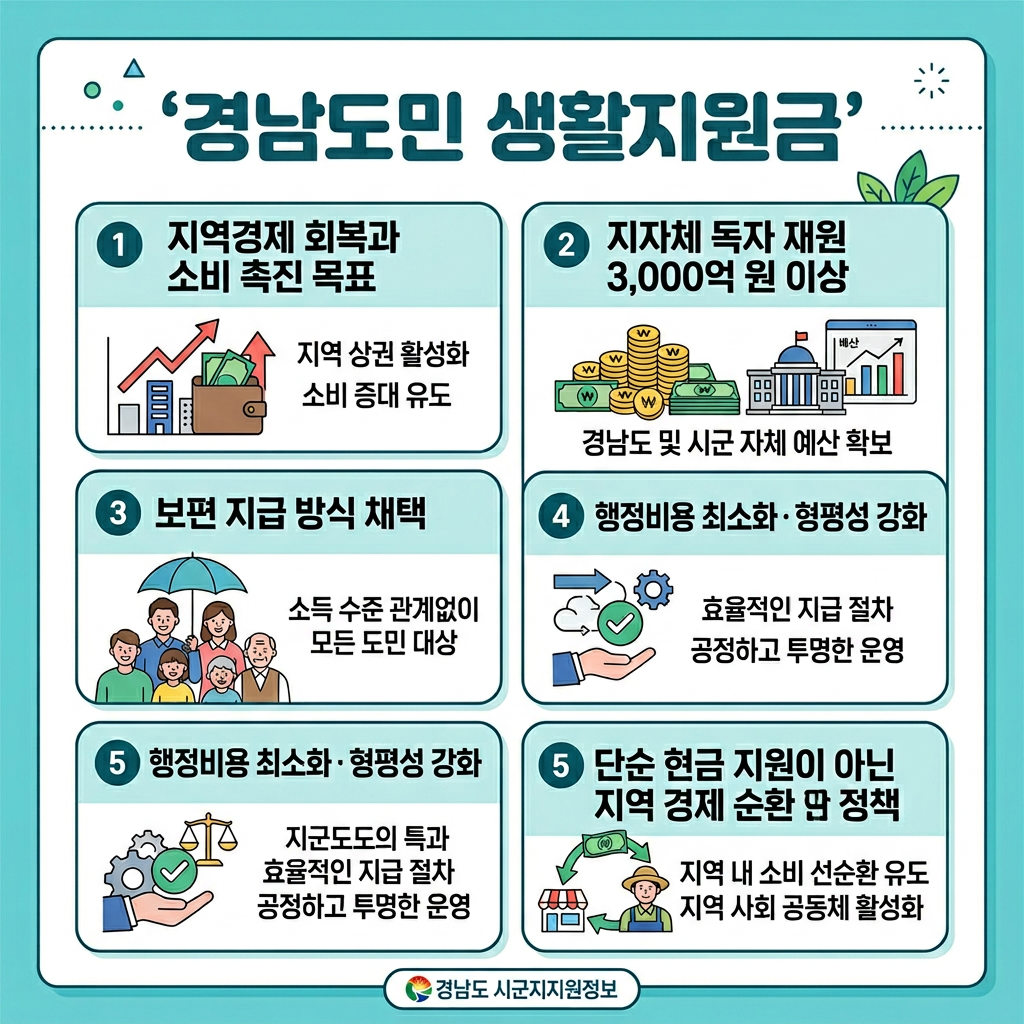 경남 도민생활지원금은 고물가·고금리 상황에서 도민의 실질적인 생활 부담을 줄이고, 동시에 침체된 지역 상권을 활성화하기 위해 시행되는 민생 안정 정책입니다.