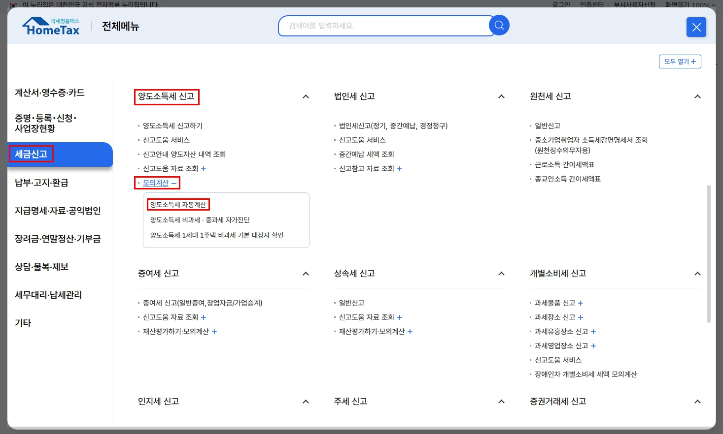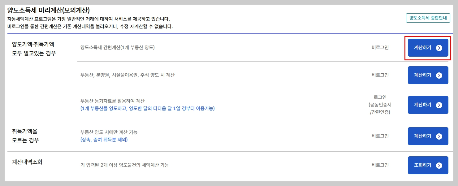 - “양도소득세 자동계산” 메뉴 선택