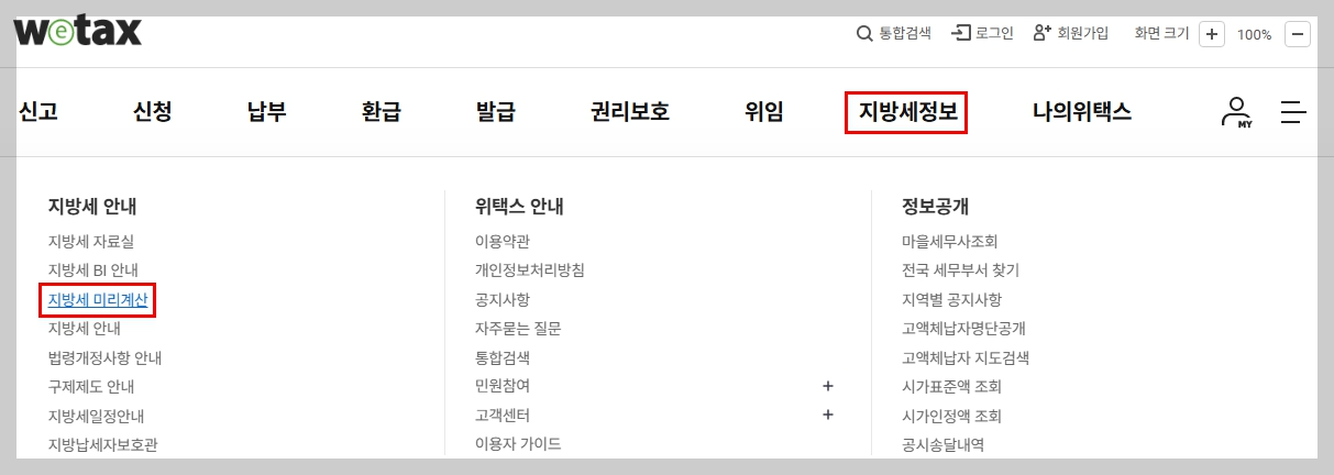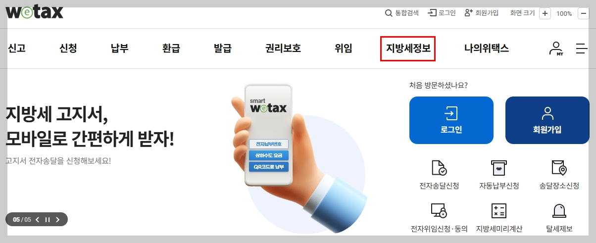 - 상단 메뉴 → 지방세 정보