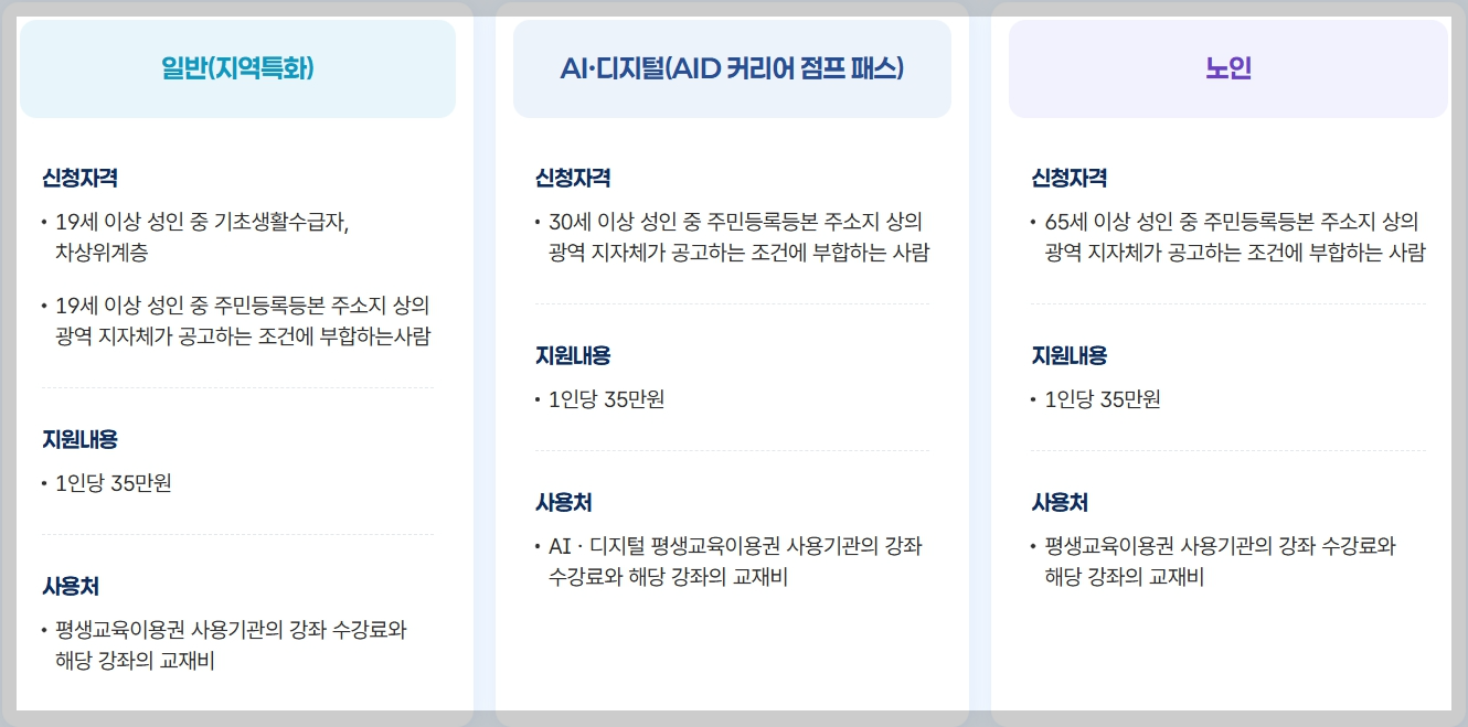 특히 최근에는 AI·디지털 교육, 직업능력 향상 교육, 자격증 과정, 취미 및 교양 교육 등 다양한 분야에서 사용할 수 있어 성인 학습 지원 정책 중 활용도가 높은 제도로 평가받고 있습니다.