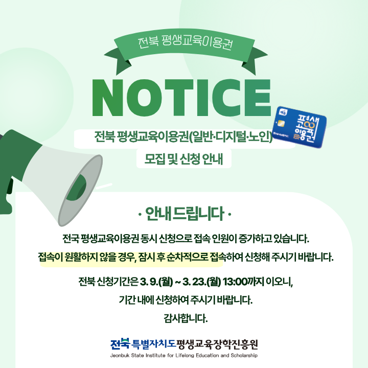 평생교육 이용권 신청기간은 전국 동일한 일정이 아니라 지자체별로 각각 공고됩니다. 일반적으로 3월부터 신청이 시작되며 지역별 일정에 맞춰 접수해야 합니다.