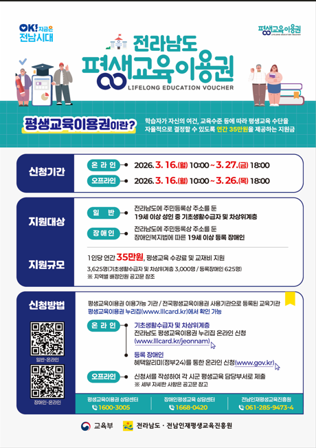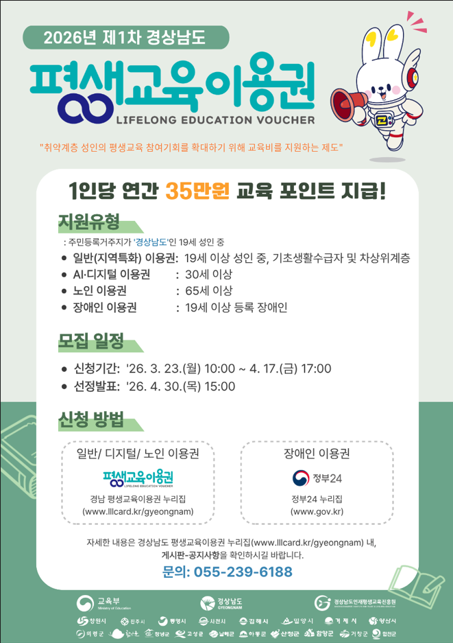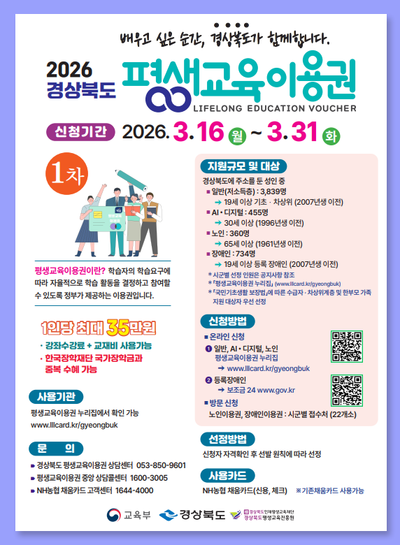 평생교육 이용권은 성인 학습자에게 최대 35만 원 교육비를 지원하는 대표적인 정부 교육 바우처입니다. 특히 2026년에는 AI·디지털 교육과 지역 특화 프로그램이 확대되면서 활용도가 더욱 높아지고 있습니다. 신청기간은 대부분 3월부터 시작되므로 해당 지역 공고를 확인하고 누리집에서 빠르게 신청하는 것이 중요합니다.