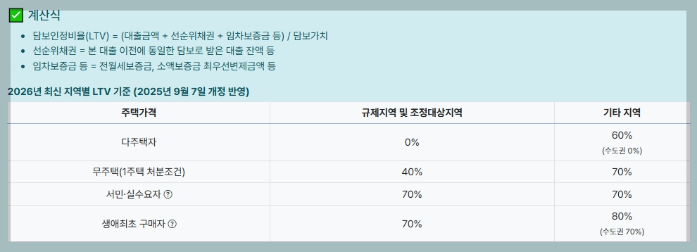 따라서 LTV는 단일 대출이 아닌 전체 담보대출 합산 기준이라는 점이 중요합니다.